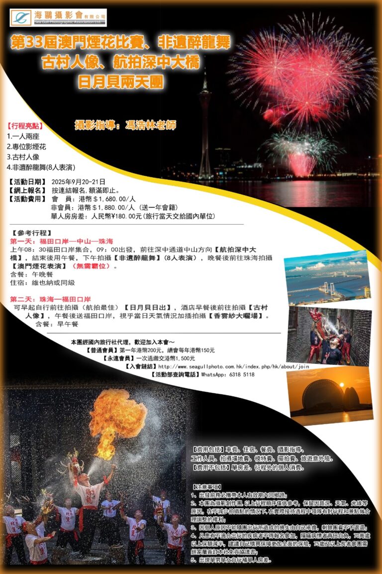 第33屆澳門煙花比賽、非遺醉龍舞、古村人像 航拍深中大橋、日月貝兩天團 (額滿,多謝支持) 了解更多 >>