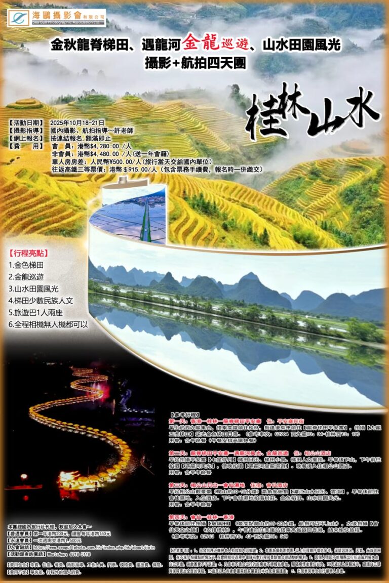 桂林金秋龍脊梯田、遇龍河金龍巡遊、山水田園風光 攝影+航拍四天團 了解更多 >>