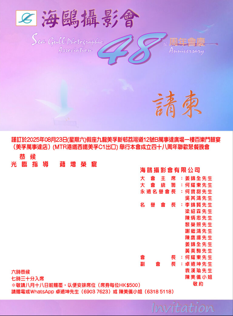 海鷗攝影會2025年度季賽績分表 (截至七月) 了解更多 >>